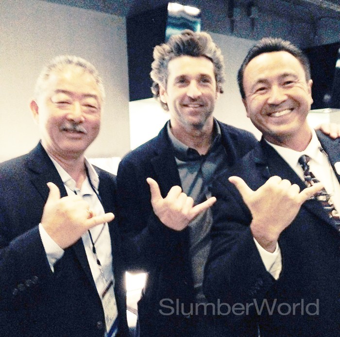 Hawaiian style at Las Vegas furniture market! L-R: Clark Okazaki (SlumberWorld Manager/Buyer), Patrick Dempsey (Spokesperson for Simmons Beautyrest Black), and Lance Matsuda.